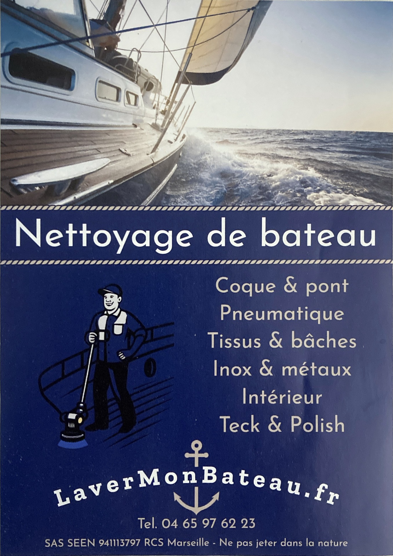 Un service complet de nettoyage intérieur et extérieur est proposé : lavage manuel, brosse mécanique, polish de coque, entretien du gelcoat, vitres, PVC, aluminium, inox, bois, polyester, cuir, voiles, pare-battages et pneumatiques. Les produits utilisés respectent les normes UE de sécurité et l’environnement, pour un entretien écoresponsable qui protège à la fois le bateau et la mer.